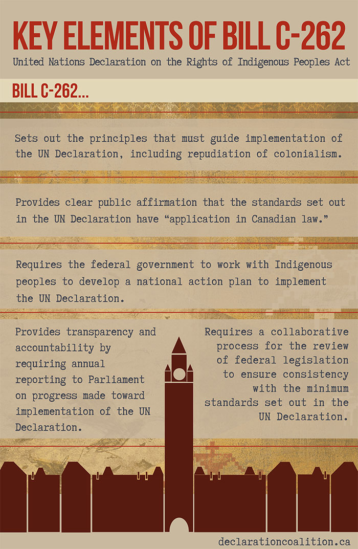 Bill C-262 creates the framework for implementation of the UN Declaration on the Rights of Indigenous Peoples. It is currently before the Senate. Unfortunately false and misleading information about C-262 continues to circulate, which is why the Coalition on the Human Rights of Indigenous Peoples, of which CFSC is a member, continues to create and circulate educational materials.