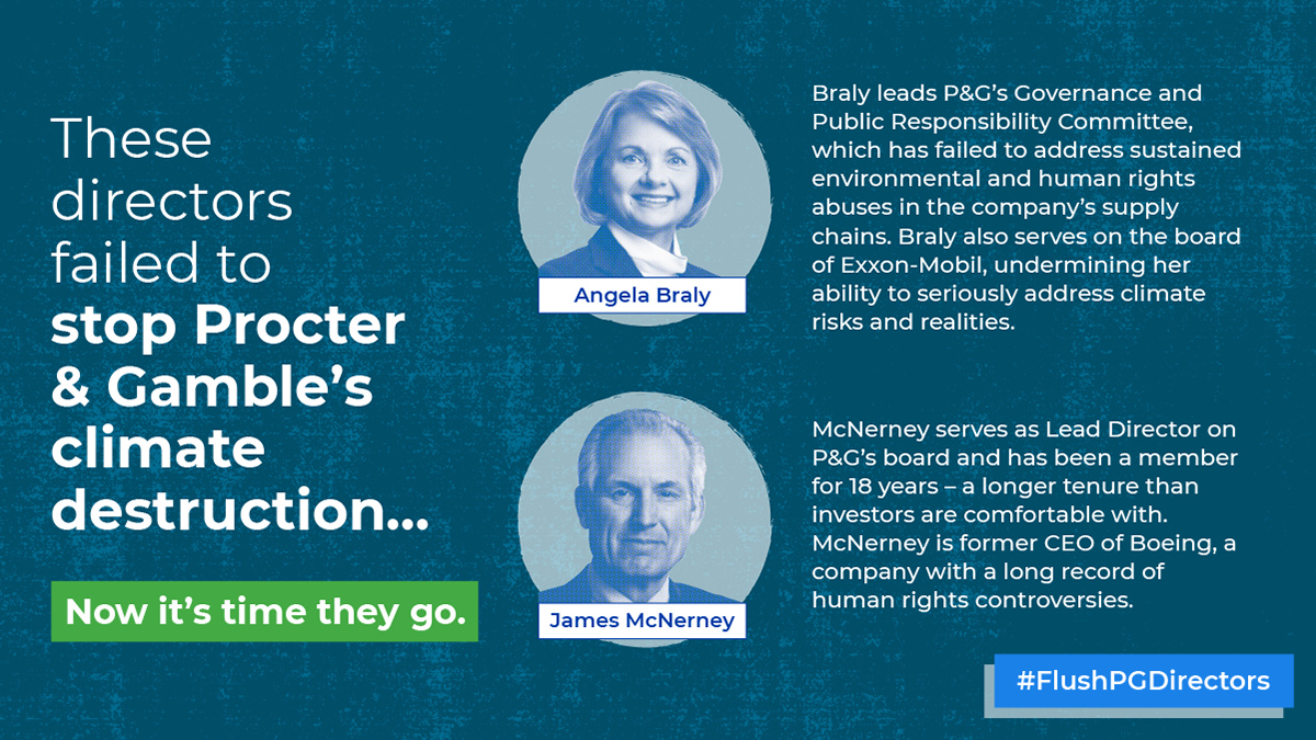 As P&G’s customers and shareholders demand that the company be aligned with the global movement to preserve and protect forests, the company needs directors who can keep up with current events. Sticking with the status quo of putting profits over people and the planet is not going to cut it.
