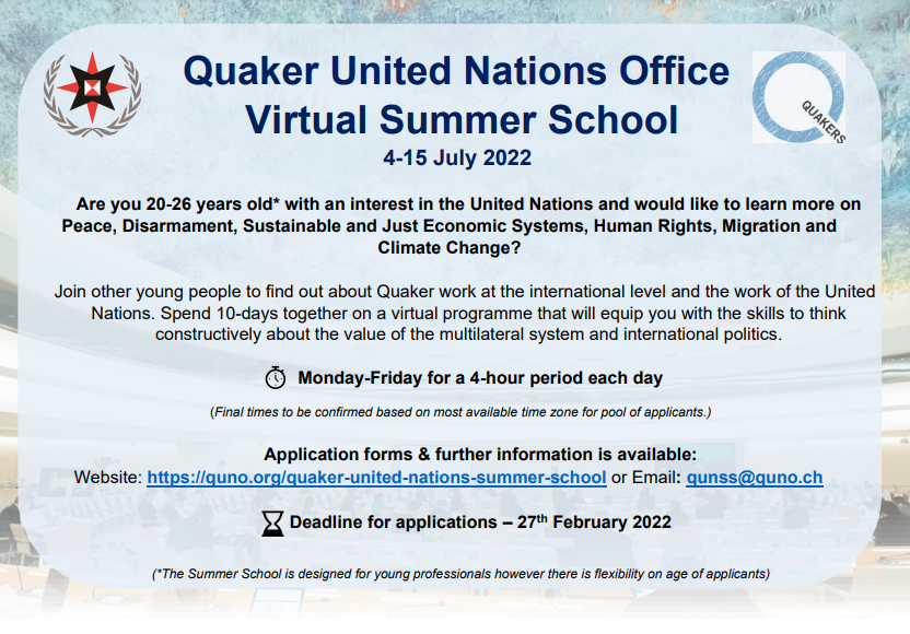 The Quaker United Nations Office is offering a virtual summer school for young people interested in the UN. This is a wonderful learning and networking opportunity running virtully from July 4th to July 15th. Applications close on February 27th: https://quno.org/quaker-united-nations-summer-school.