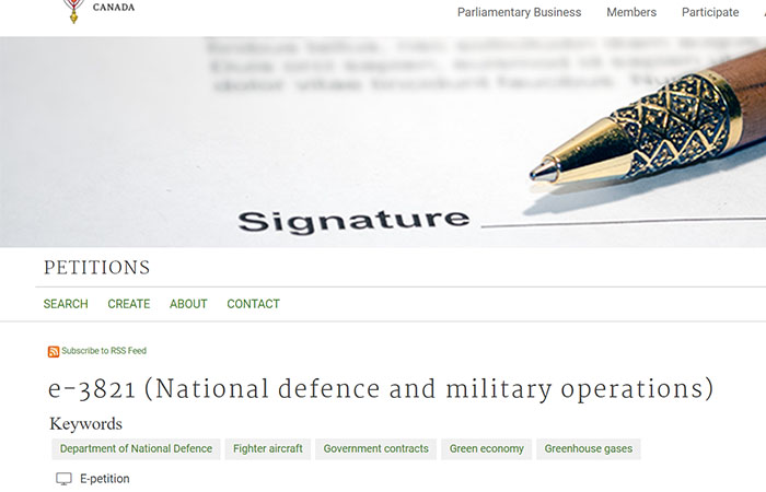 A new Parliamentary e-petition calls on Canada to cancel the purchase of 88 new fighter jets. It notes that fighter jets are for killing people internationally but conflicts can be addressed through other means. It also notes the devastating environmental impact: