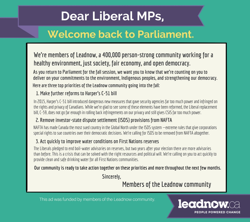 These are the Leadnow community’s priorities for the fall session of Parliament, and we want to make sure Liberal MPs see them as they head back to work on Monday.