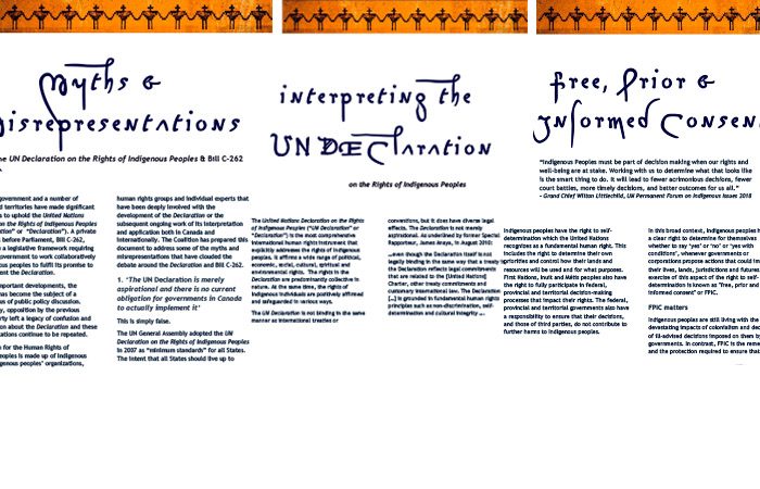Myths and Misrepresentations: The UN Declaration on the Rights of Indigenous Peoples & Bill C-262 explores key myths circulating, such as that the UN Declaration creates special rights for Indigenous Peoples that other people don’t have, and that Bill C-262 (to make Canada’s laws consistent with the UN Declaration) would create chaos. Interpreting the UN Declaration on the Rights of Indigenous Peoples highlights and corrects mistakes we see all the time that lead to misinterpretations of the Declaration. Finally, Free, Prior and Informed Consent answers common questions you might have, like, “What is free, prior and informed consent? Where does it come from? When does it apply? Who has the right to grant or withhold it? Is it the same thing as a veto?” https://quakerservice.ca/factsheets