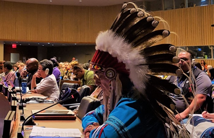Grand Chief Wilton Littlechild reads a joint statement at the UNPFII 2018. Photo: Rachel Singleton-Polster