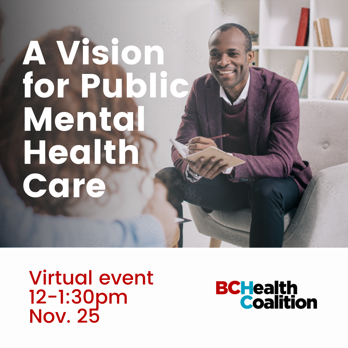 The time is now for public mental health care. Our current public health care system covers few mental health resources, and what is covered is often too little, too late. It doesn't have to be this way.In this second part of a mental health panel series on November 25th, the BC Health Coalition will bring together key leaders in the area of mental health to explore a vision for public mental health care. Click here to register.