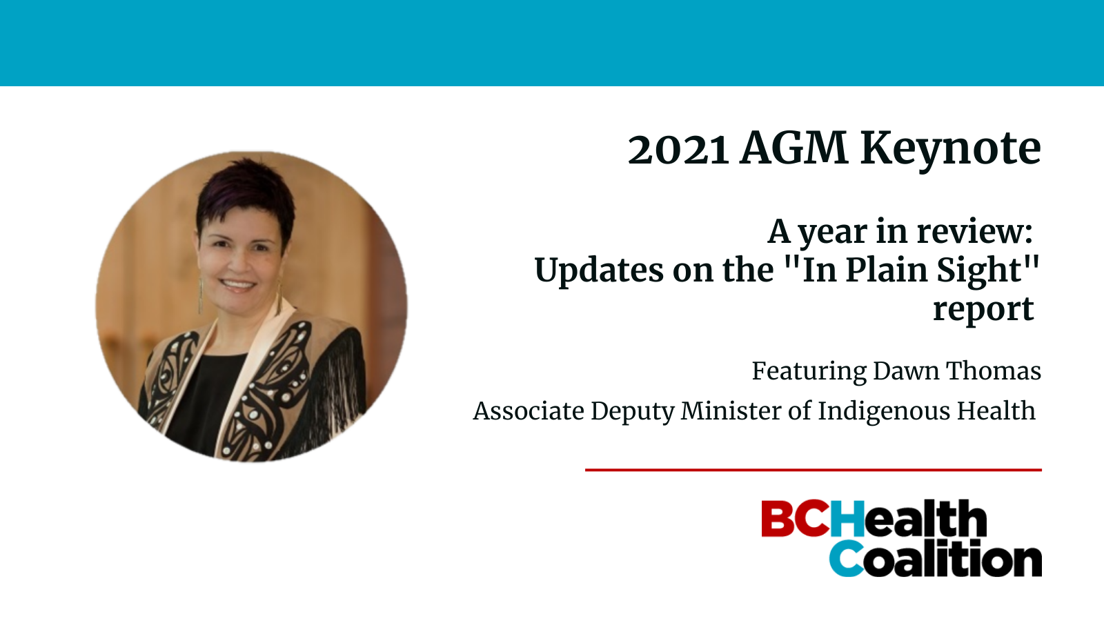 Almost one year after the release of In Plain Sight: Addressing Indigenous-specific Racism and Discrimination in B.C. Health Care, Assistant Deputy Minister of Indigenous Health Dawn Thomas delivered a keynote at the BC Health Coalition's annual general meeting. ADM Thomas shared an overview of the report and provided updates on the implementation of the recommendations.