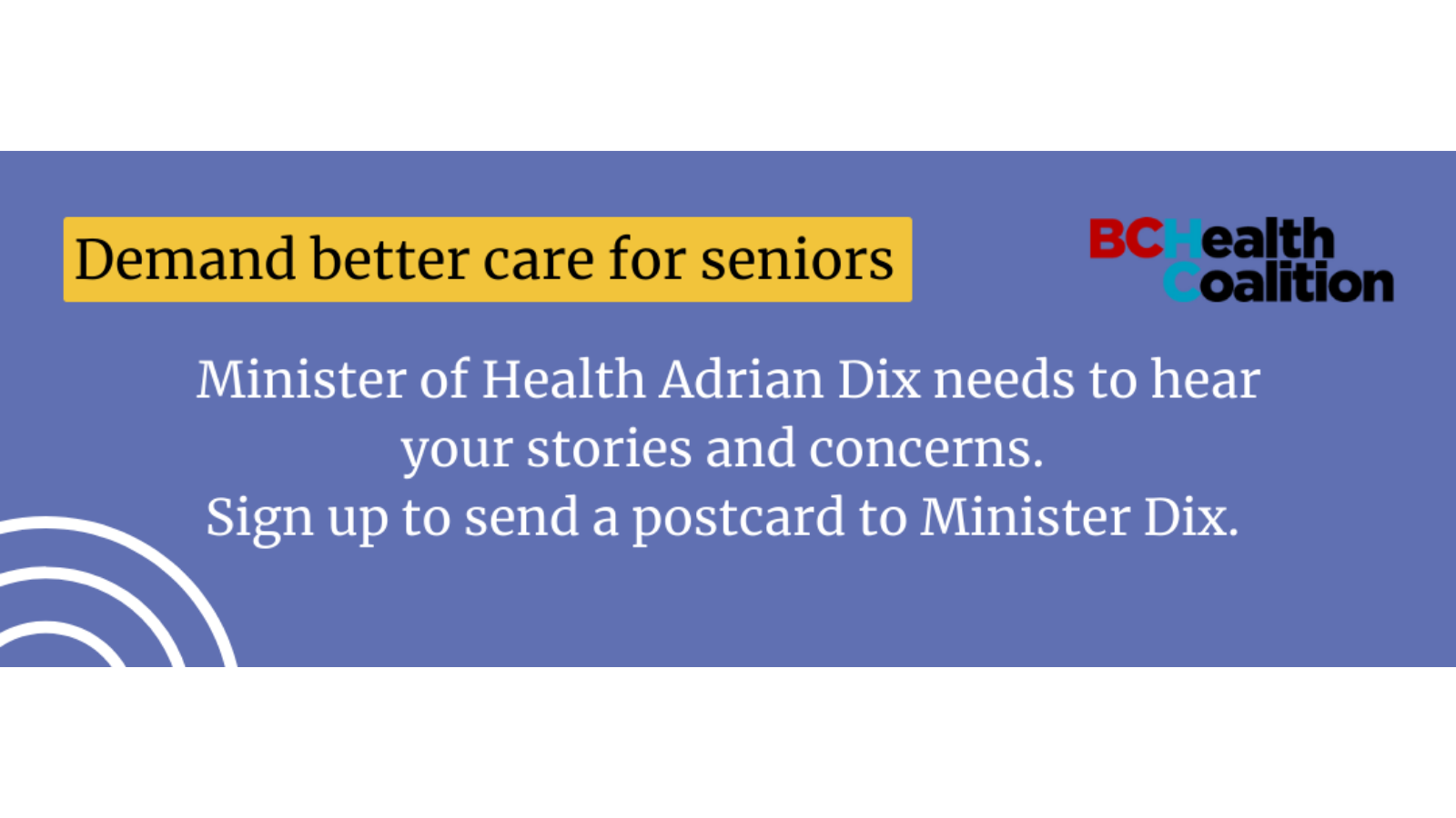 We need to improve and expand publicly funded home support and end for-profit long-term care! However, over the past twenty years, home support has been devalued through inconsistent funding and poor work conditions while for-profit long-term care companies have been pocketing public funds as profits instead of spending them on care. You can join thousands of BCHC members and allies as we demand better care for seniors by sending Minister Dix postcards with our stories and demands for better care.