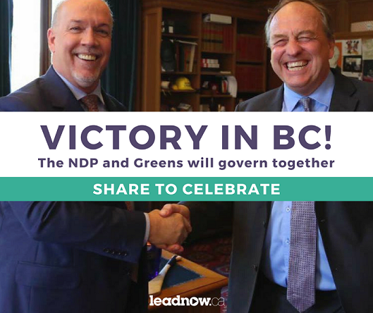We won! After weeks of pulling dirty tricks to try to hold onto power, Christy Clark’s Liberal government has officially been defeated. BC's Lieutenant-Governor just invited the NDP to form government after Christy Clark lost a vote of confidence in the legislature — and thanks to a historic cooperation agreement struck last month, the NDP and Greens will govern the province together. [1]