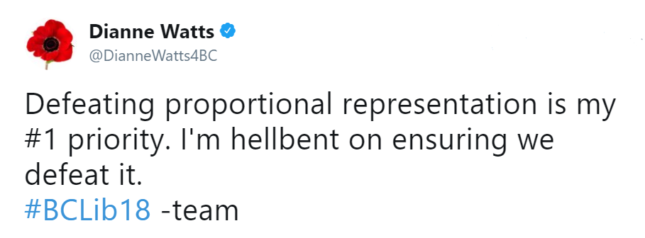 “If we do not defeat this referendum, there will be no majority, there will be forever a minority of BC Liberals…. Defeating proportional representation is my #1 priority. I am hell-bent on defeating it.”