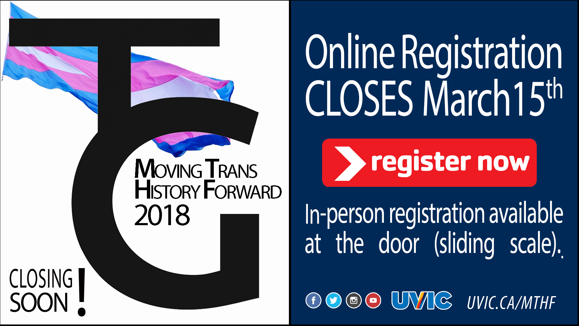 Online registration closes March 15th! In-person registration available at the door (sliding scale). Join community activists, academic, artists, and allies from around the globe for the third Moving Trans History Forward conference. This conference is a unique blend of community folks, academics, and allies. All events are held on the beautiful University of Victoria campus, located on the traditional territory of the Songhees, Esquimalt and WSÁNEĆ peoples whose historical relationships with the land continue to this day. Share your voice and your history. Learn from others. Grow together. Make history!