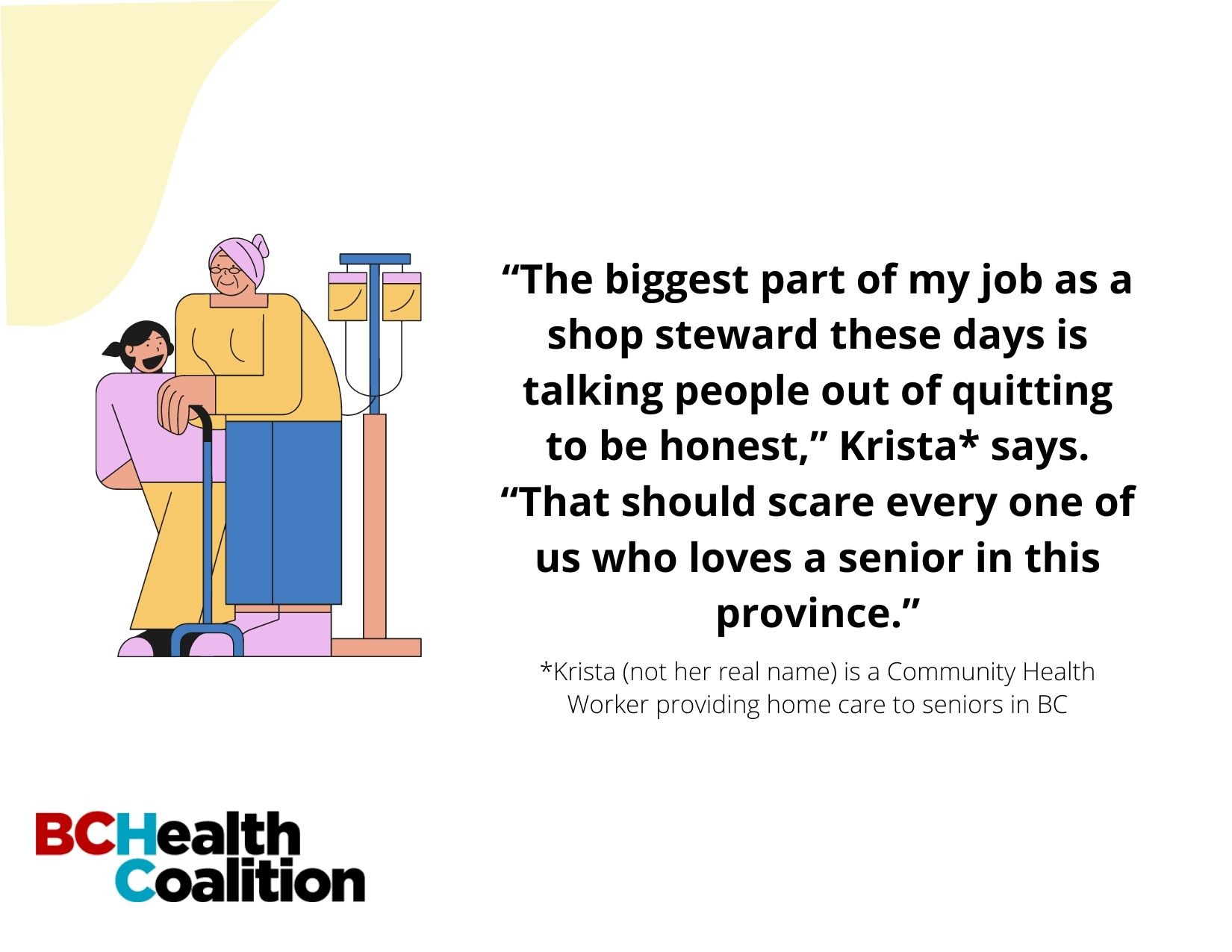 "The biggest part of my job as a shop steward these days is talking people out of quitting, to be honest," Krista says. "That should scare every one of us who loves a senior in this province."